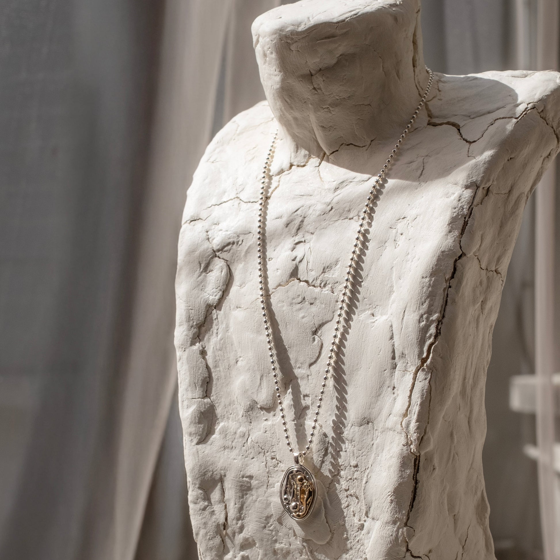 Collar Claraumbra en plata .925, compuesto por dos figuras simbólicas: la Sombra con un diamante negro natural y la Luz con un diamante blanco natural. Una pieza que representa el viaje interior y la unión entre ambas fuerzas.