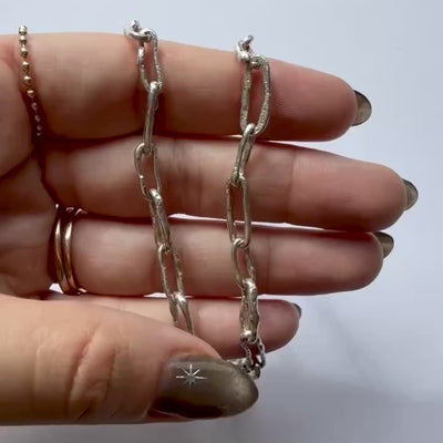 La Imperfecta es una cadena ancha de plata .925 hecha completamente a mano, eslabón por eslabón. Ninguno es igual a otro. Como el camino real.