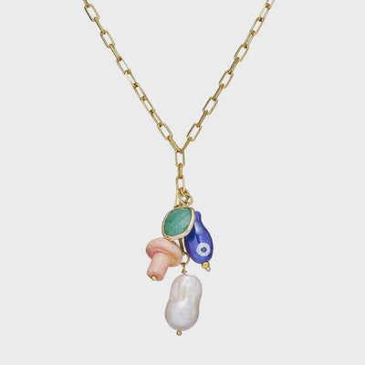 Collar Largo Multicharm chapado en oro con perla natural, dijes de ceramica y cuarzo.